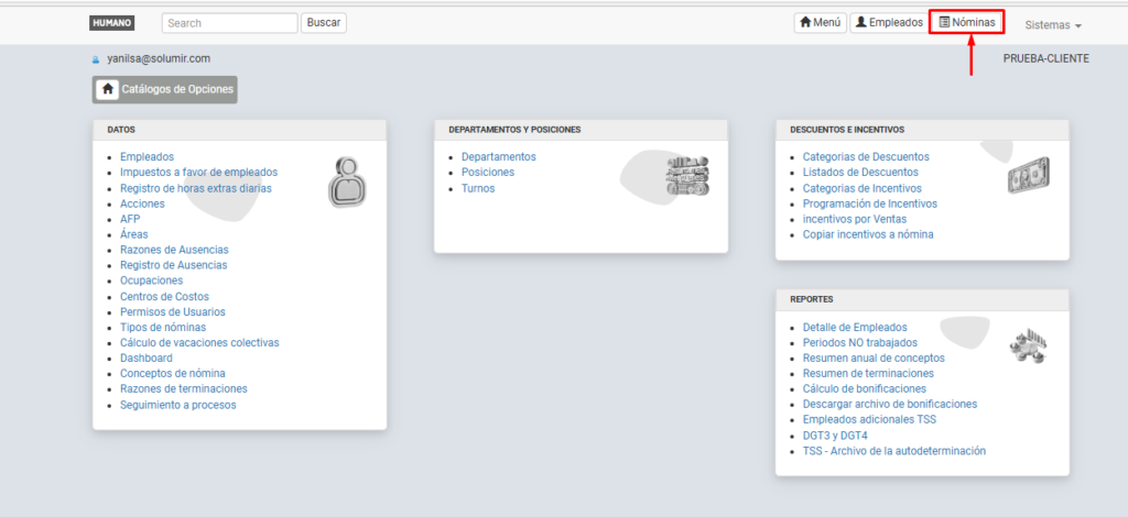 Dirígete al menú superior derecho y haz clic en la opción Nómina.