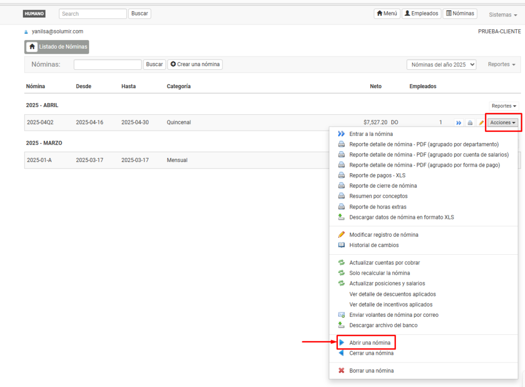 Se mostrará el listado de todas las nóminas disponibles. Selecciona la nómina que deseas eliminar. Luego, selecciona Acciones y elige la opción para abrir la nómina.