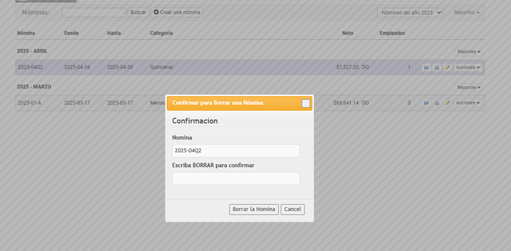 Este proceso de confirmación es una medida de seguridad que garantiza que la eliminación de la nómina sea intencional y definitiva.