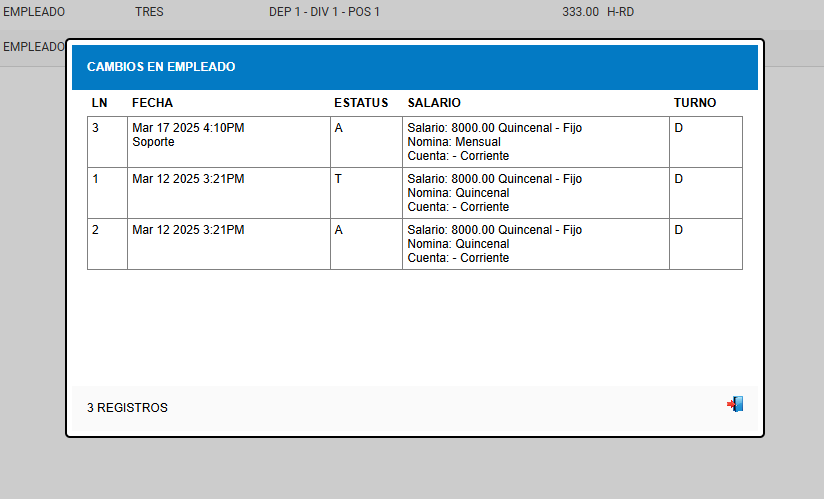 El sistema mostrará todos los cambios realizados al empleado, incluyendo modificaciones de salario y otros datos relevantes.