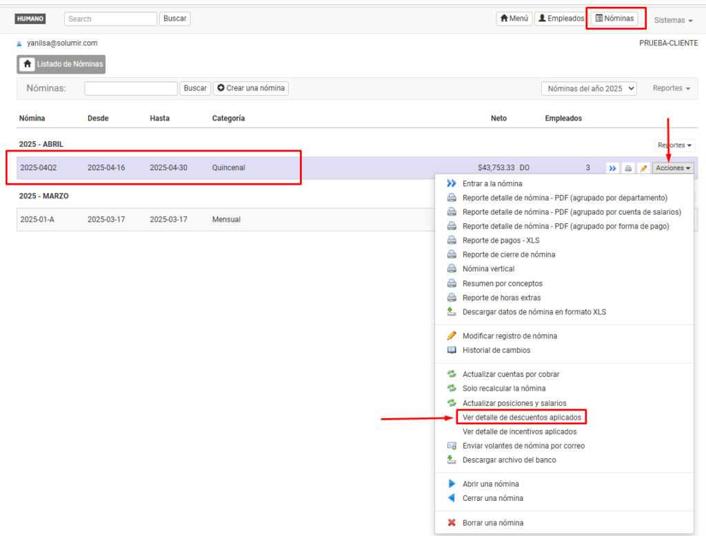 2. Selecciona la nómina en la que deseas visualizar los descuentos.