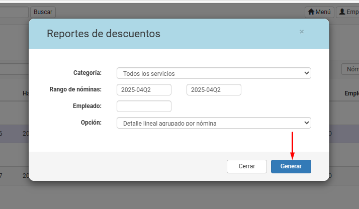 • Código del empleado: Ingresa el código si deseas consultar un empleado en específico o déjalo en blanco para incluir a todos.