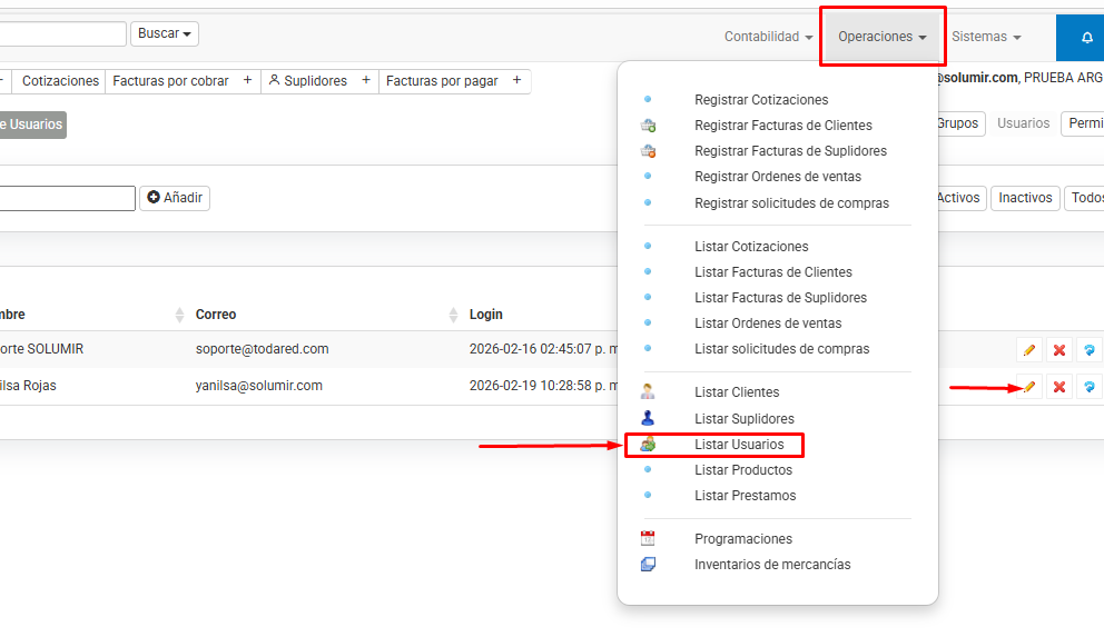 Una vez se muestre el listado, debe hacer clic en el ícono del lápiz para editar el perfil del usuario correspondiente.