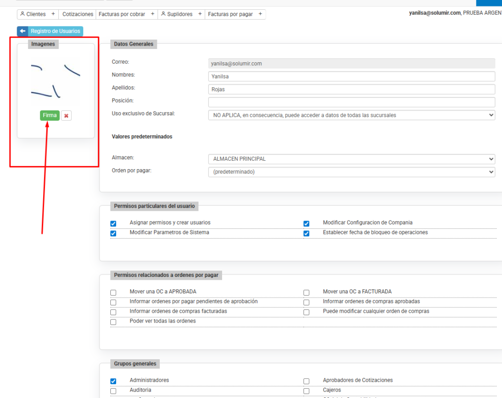 Dentro del perfil, se visualizarán los datos generales y los permisos asignados. En el menú lateral izquierdo, seleccione la opción Firma.